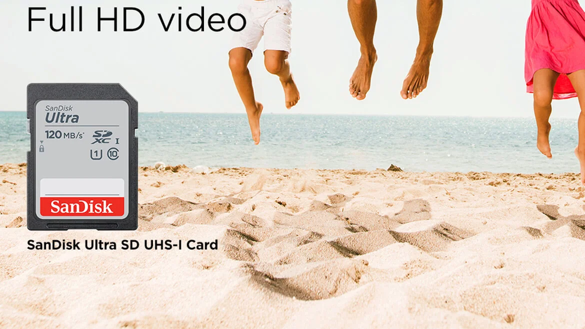 SanDisk Ultra SD cards are fast with exceptional video recording performance to let you capture your memories when they happen. Save time with ultra-fast speeds to help you quickly move your photos and Full HD videos. Transfer up to 875 photos in one minute.